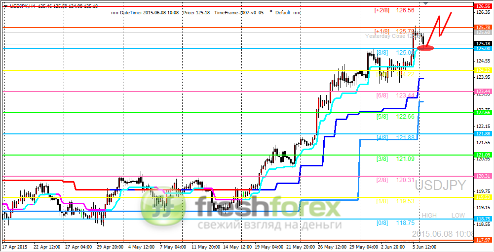 08 июня 2015, USD/JPY. Пара вошла в область перекупленности.