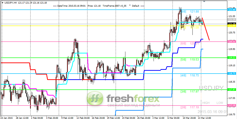 16 марта 2015, USD/JPY. Пара продолжает консолидироваться в узком диапазоне.