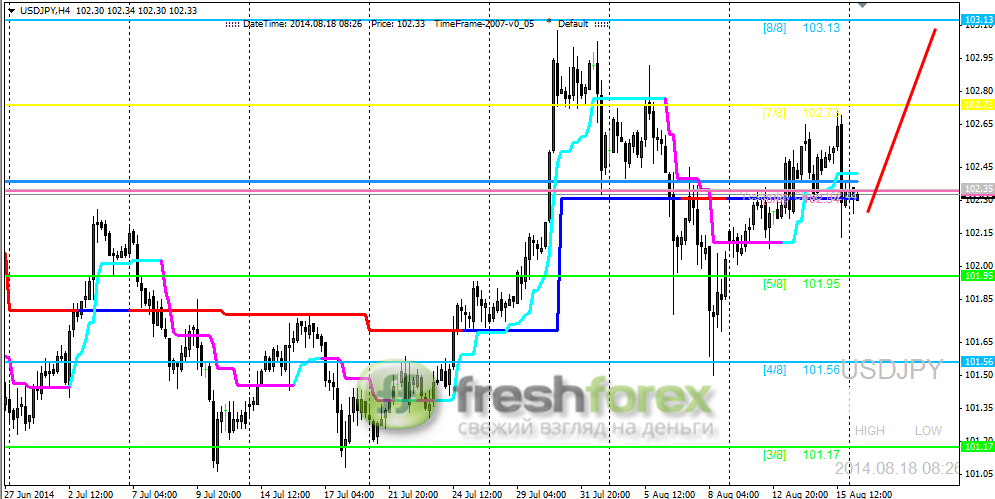 18 августа 2014, USD/JPY. Цена не может закрепиться ниже уровня (6/8).