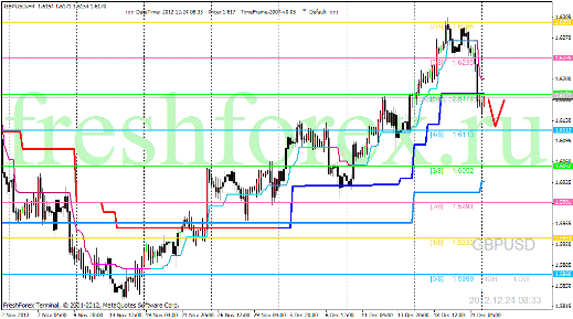 Четырехчасовой график EURUSD. После преодоления уровня 1.3184(4/8) вверх, цена дошла до уровня 1.3206 (5/8), после чего цена снизилась и пробила уровень (4/8) в обратную сторону. Данный факт является предпосылкой бокового движения в канале (3/8 -5/8) и на данный момент, мы ждем подтверждения этого варианта. Оно будет заключается в снижении и последующем отскоке от нижней границы канала 1.3062 (3/8), если отскок произойдет, в ближайшее время цена проведет в горизонтальном движении.