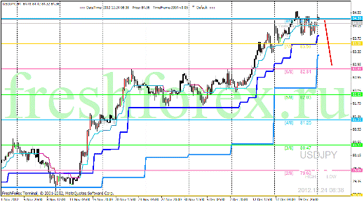 Четырехчасовой график пары USD/JPY. Последние сутки цена консолидировалась и значительного снижения не произошло, тем не менее, ситуация остается неизменной и цель остается на уровне 82.81(6/8), поскольку уровень 84.38 (8/8) это достаточно сильный уровень сопротивления, который может вызвать не только коррекционные снижения но и разворот тренда.