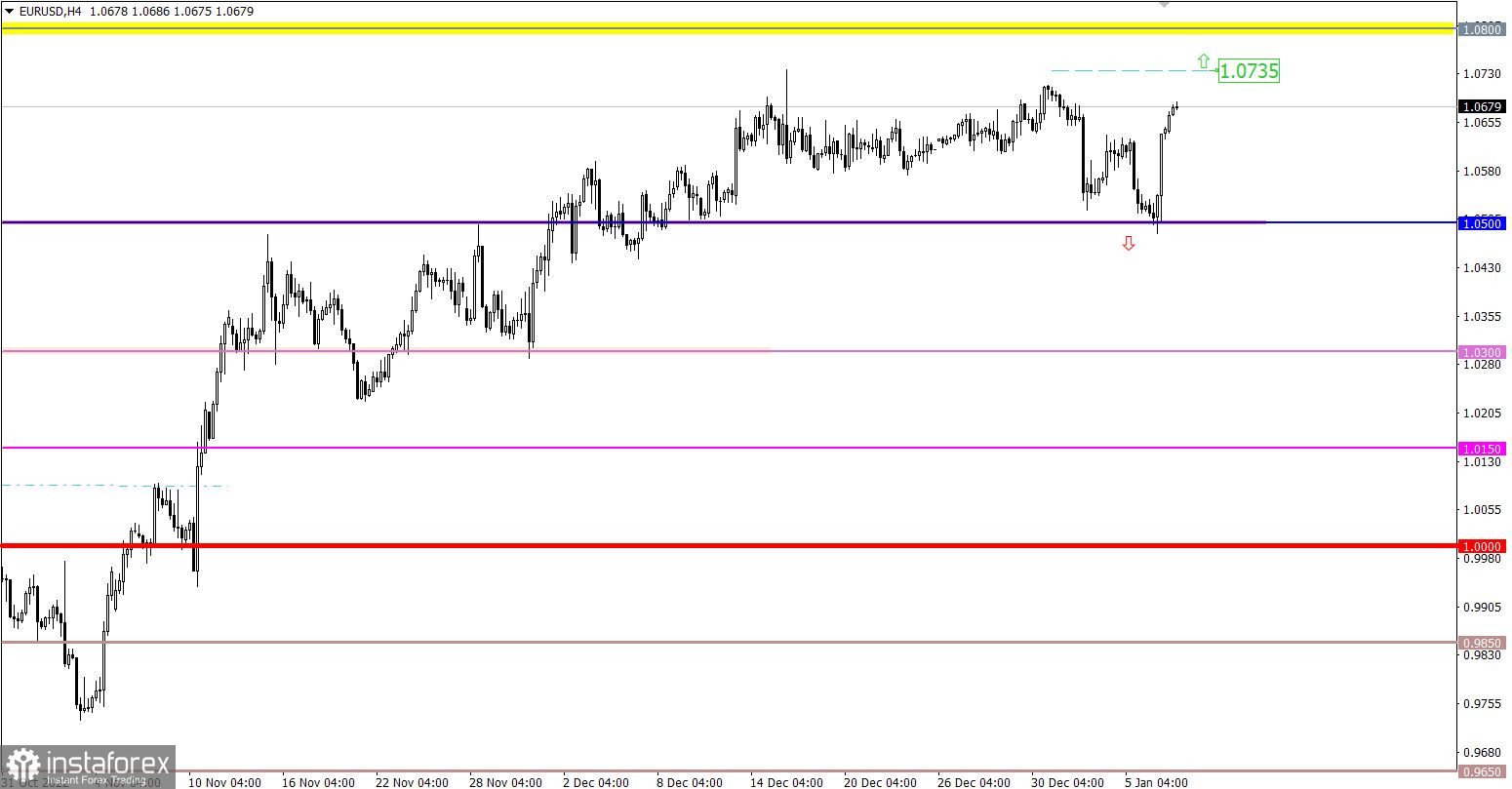 Валютная пара EURUSD в минувшую пятницу сменила направление с нисходящего на восходящий цикл. В качестве опоры сыграл уровень поддержки 1.0500, относительно которого возник инерционный восходящий ход. Вследствие чего курс евро укрепился более чем на 150 пунктов.
