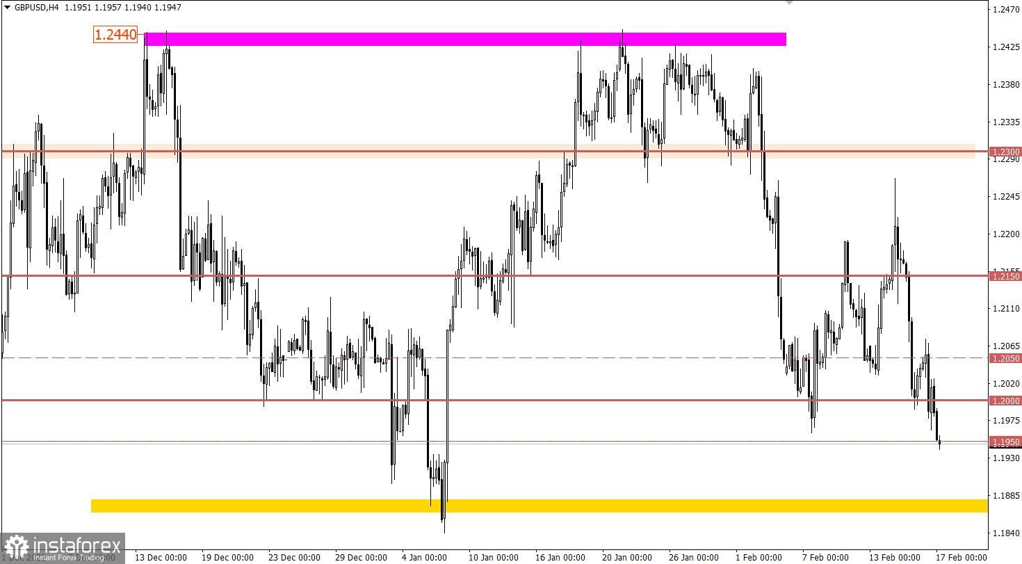 Валютная пара GBPUSD уверенно движется по нисходящей траектории, если исходить из ценового движения с 14 по 17 февраля. Этот ценовой ход привел к ослаблению стоимости английской валюты примерно на 250 пунктов. Наиболее примечательным моментом стал тот факт, что психологический уровень 1.2000 оказался под ударом продавцов, что указало на высокие шансы его пробоя.