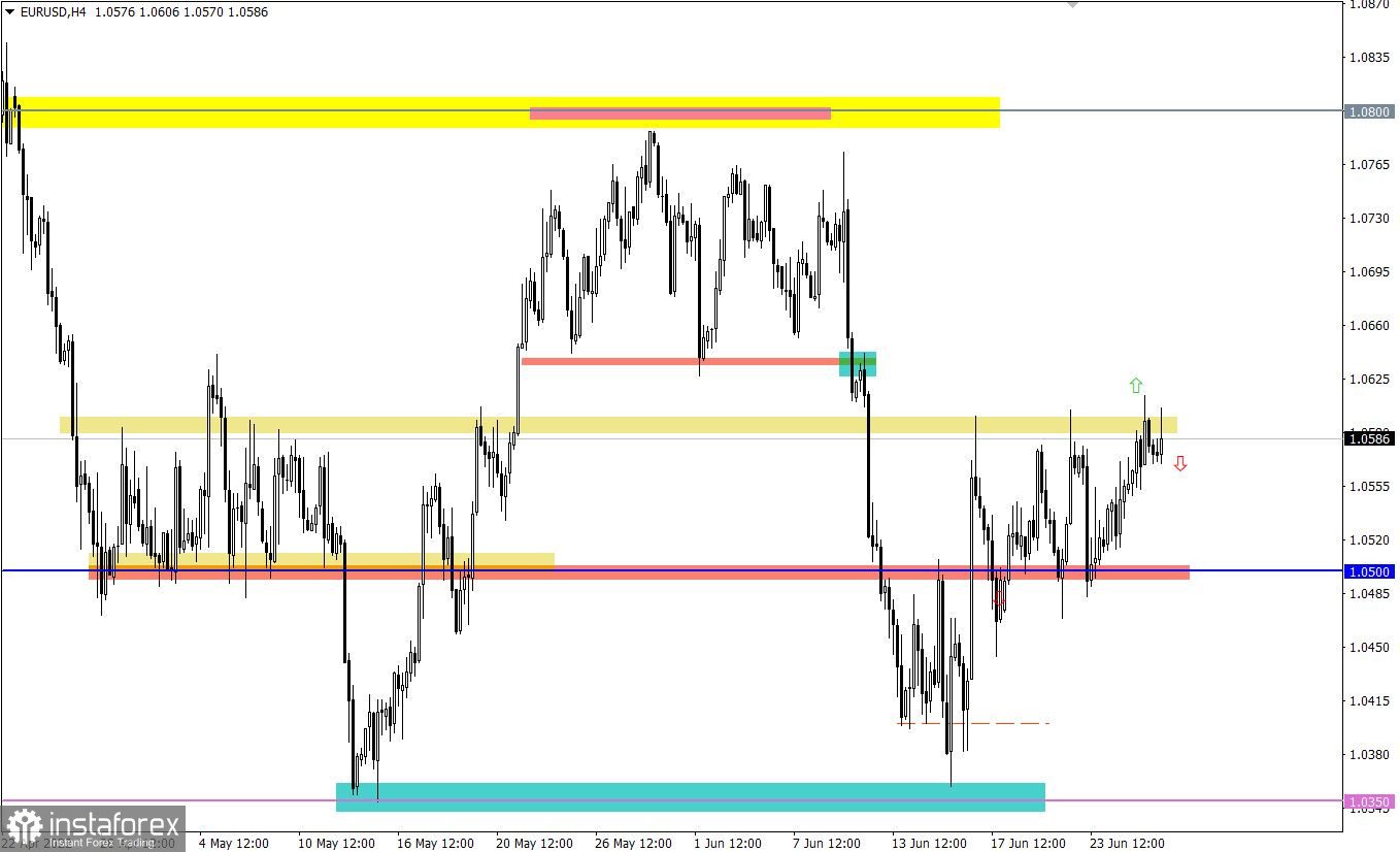 Валютная пара EURUSD замедлила восходящий темп после сближения цены с верхней границей флэта 1.0500/1.0600. Этот шаг привел к сокращению объема длинных позиций и, как результат, откату.