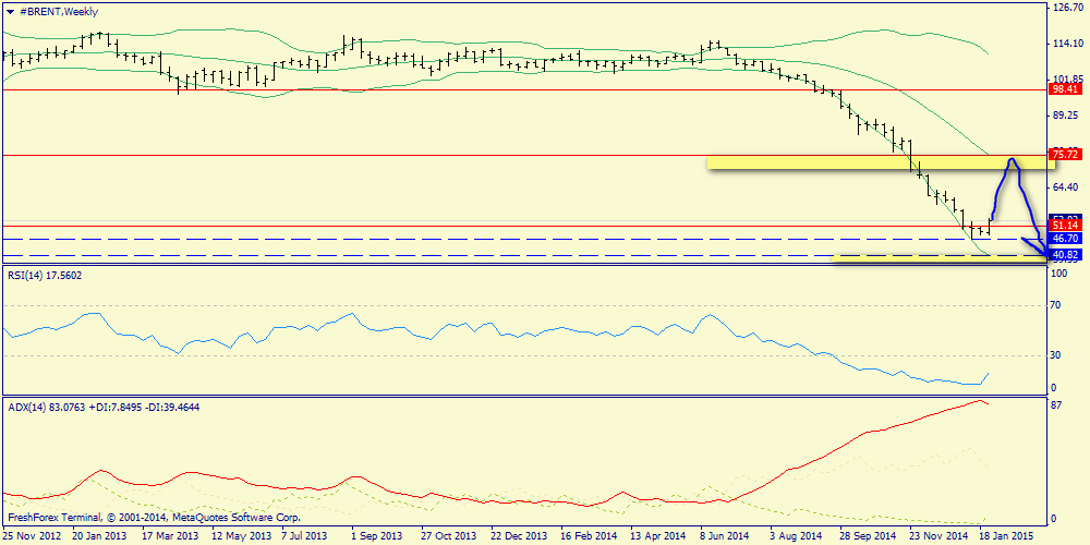 Месячный график: итак, была встречена эффективная поддержка на 49.70, которая спровоцировала существенную коррекцию под самое закрытие месяца выше 53-х долларов за баррель. Однако мы видим, что ADX только набирает обороты и далек от окончания давления, поэтому вероятность дальнейшего падения к 38.50 - большая.
