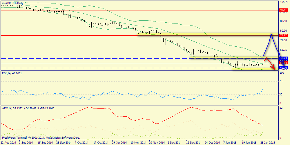 Дневной график: еще одно внушительное сопротивление расположено на 55.23 (верхняя полоса Боллинджера). ADX отвернут от бычьего движения, поэтому очень возможно, что для покупателей всё закончится именно на 55.23 (см. красную стрелку).