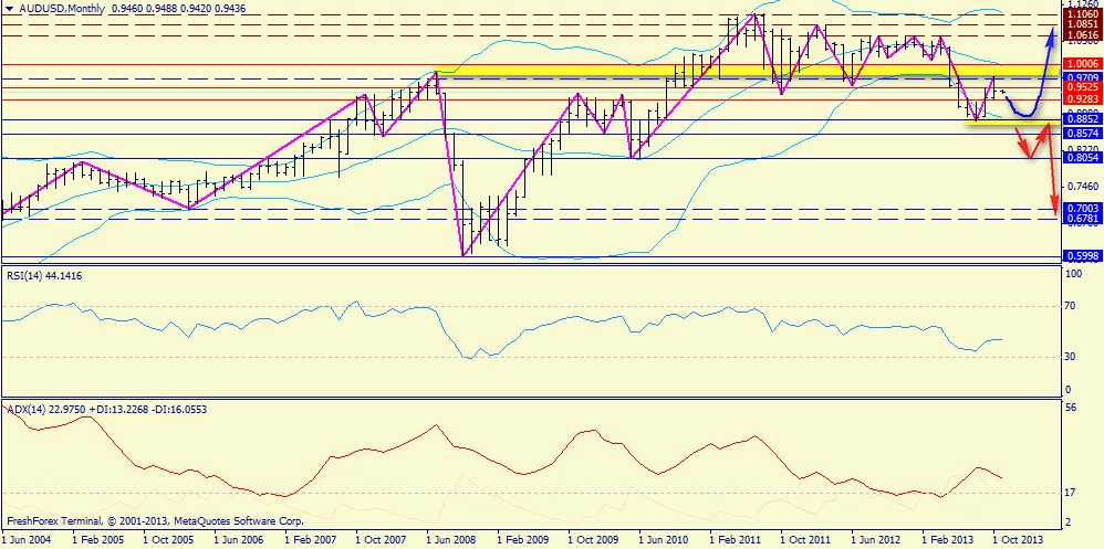 Месячный график: похоже, что восходящая коррекция себя исчерпала. Но у быков в загашнике есть вариант с двойным дном в зоне (0.8852, синяя стрелка). Продолжение даунтренда проявится с пробоем 0.8850 и минимальной целью может стать 0.8054.