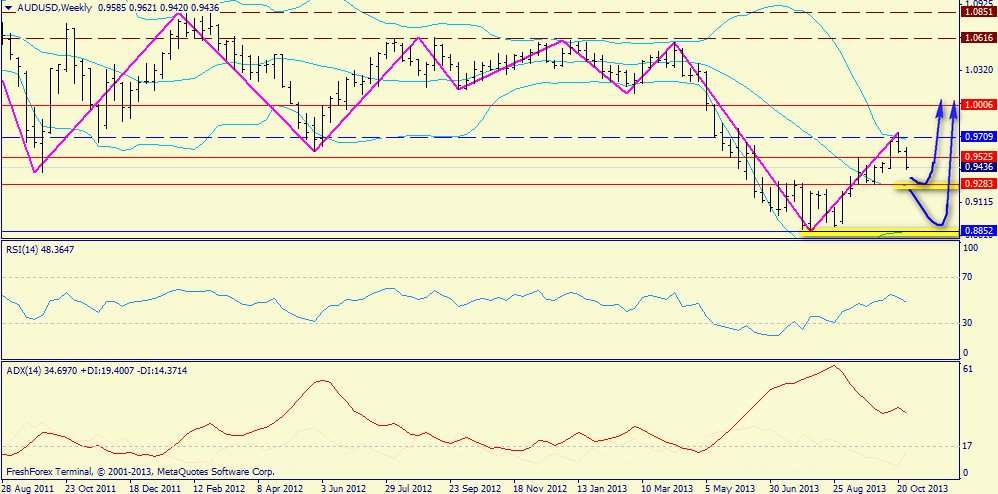 Недельный график: ADX трактует текущее снижение пары как коррекцию, поэтому мы вправе ожидать рост (т.е. общий разворот пары) или от уровня 0.9283 (средняя Боллинджера), либо от 0.8850 (в рамках формирования двойного дна).