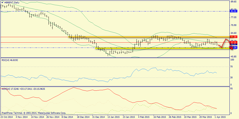 Месячный график: итак. случилось то, чего мы ждали, а именно - мартовский ИБ. Положение полос Боллинджера и состояние ADX - чудовищны для быков: целью нового падения нефти представляется уровень 43.80.