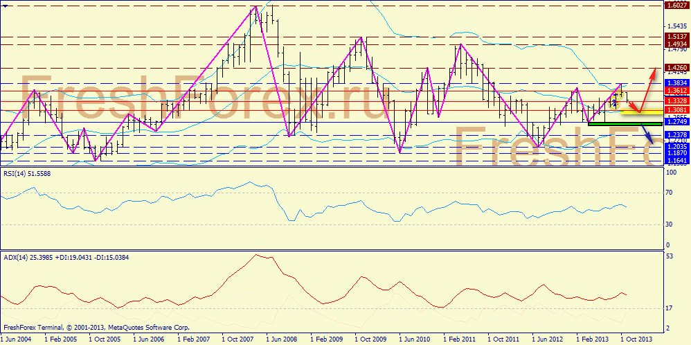 Месячный график: продолжается откат в направлении средней полосы Боллинджера (1.3081), откуда, предположительно пройдет старт вверх, к цели 1.4260.