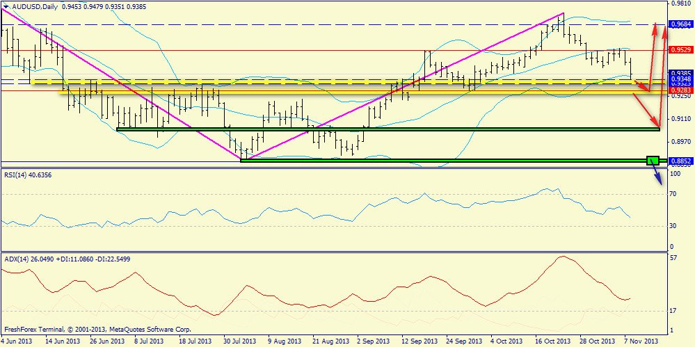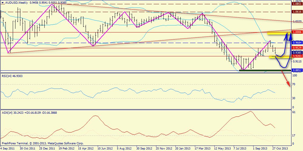 Недельный график: видна плотная поддержка на средней Боллинджера (0.9283). Следующая саппорт-зона - 0.8850-0.89.