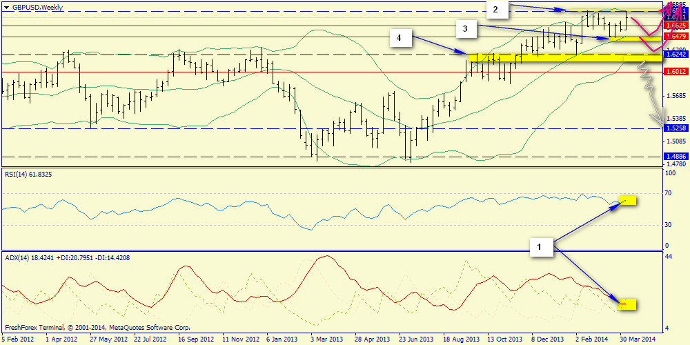 Месячный график: м видим очень активную трендовую фазу от ADX/RSI (1), что, на фоне мартовского инсайда (2), дает потенциал роста на следующей неделе минимум к верхней полосе Боллинджера (3, отметка 1.7051) и среднесрочным прицелом на 1.91 (4).
