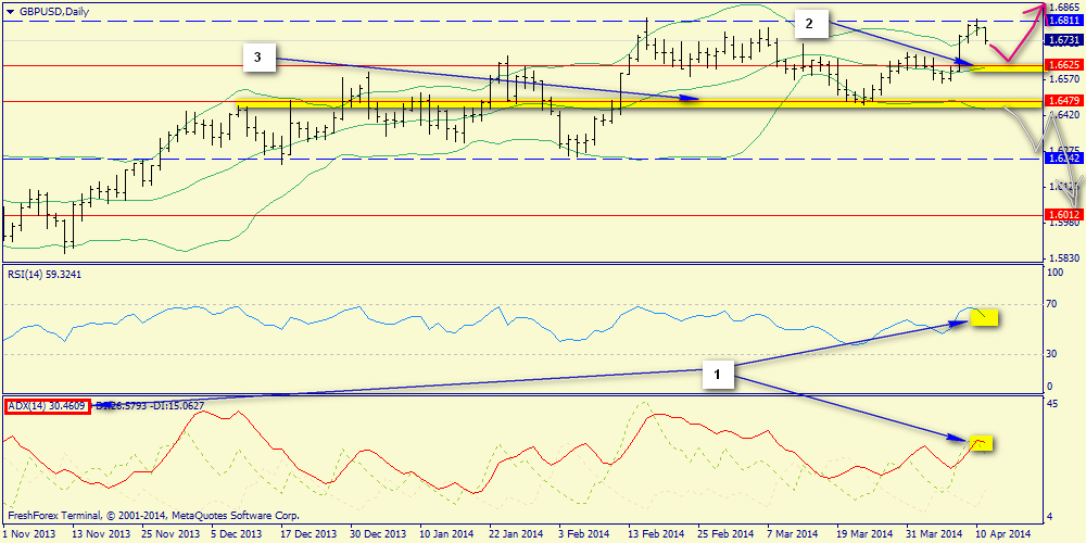 Дневной график: техническая коррекция от ADX/RSI (1), поэтому можно ждать откат к средней полосе Боллинджера (2, отметка 1.6625), либо к мощному пивоту на 1.6479 (метка 3).