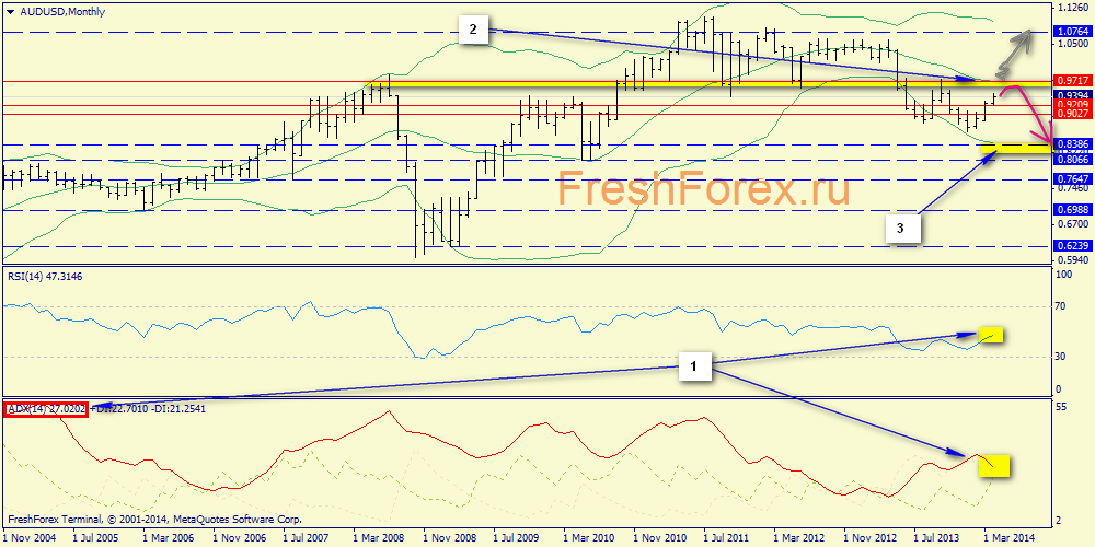 Недельный график: сильное трендовое давление вверх от ADX/RSI (1). При этом рост цены уверенно подтверждает созданную на падении конвергенцию осциллятора (2). Это означает, что касание пивота 0.9717 (3) состоится почти наверняка. Если быки подтвердят свои притязания на продолжение, то будет уместна коррекция в район средней полосы (4, отметка 0.9027), и затем будет получен среднесрочный потенциал роста к 1.0764.