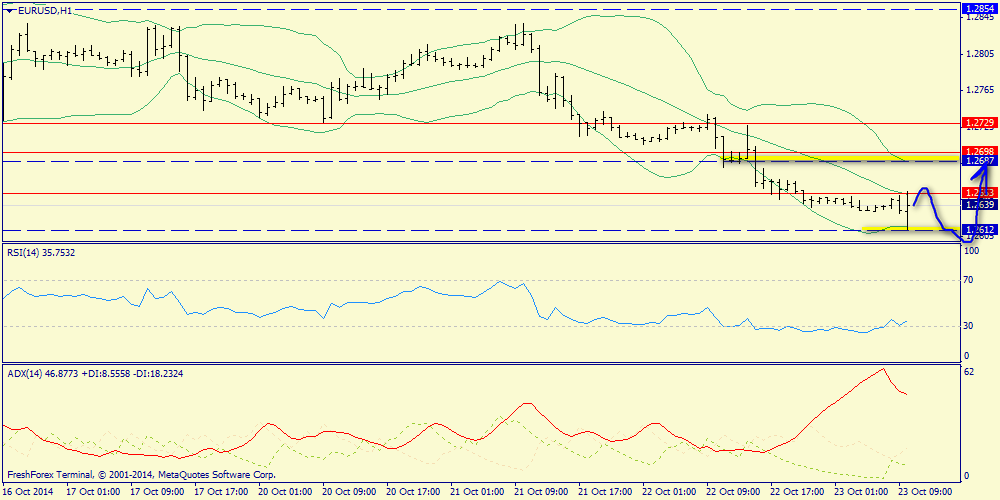 23 октября 2014, EUR/USD. Возможен разворот вверх после касания 1.2570.