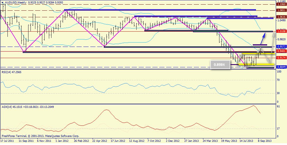 Недельный график: локальный Over&Under с точкой возможного входа от 0.8984. Так же видно, что прорыв выше 0.9572 так же обеспечит "ауди" потенциалом роста к 1.0108.