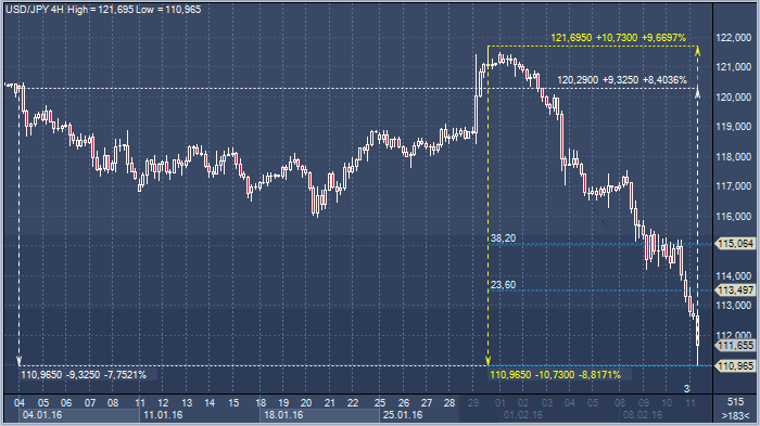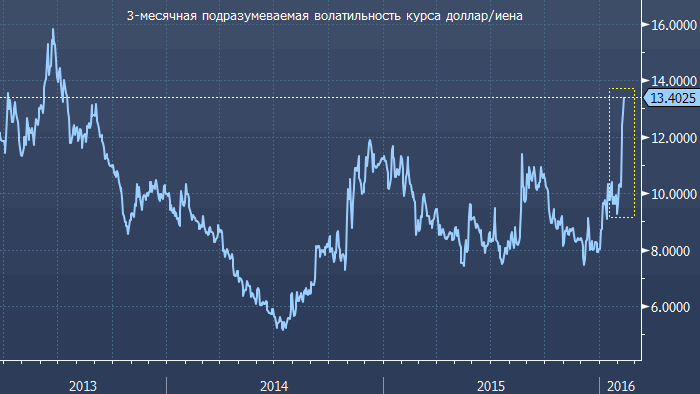 Немного статистики достижений иены, приобретенных японской валютой в рамках текущего «крестового похода». С начала 2016 года иена выросла в цене против 150 валют, отслеживаемых агентством Bloomberg. По отношению к доллару США с начала года иена укрепилась приблизительно на 7.75%. Если считать от максимумов, которых курс доллар/иена достиг в пятницу 29 января, когда Банк Японии объявил о введение отрицательных процентных ставок, то японская валюта выросла в цене к американскому конкуренту почти на 8.8%. 3-месячная подразумеваемая волатильность в паре доллар/иена (расчет основан на опционах ATM) выросла до 13.38%. Это максимум с 16 июля 2013 года.
