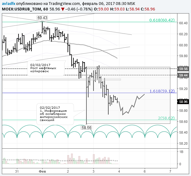 Понедельник – день противоречивый. Цена чаще движется против пятницы. Если на торгах в Европе рост нефтяных котировок продолжится, курс доллара двинется к минимуму 58,56 руб. от 02.02.17, курс евро – к 62,32 руб. После пробоя уровня 58,50 руб., продавцам откроется дорога к уровню 56,90 руб. – первый значимый уровень, от которого стоит начинать покупать доллары. Считаем, что в понедельник пара доллар/рубль останется в ценовом диапазоне от 02 февраля 2017 года.