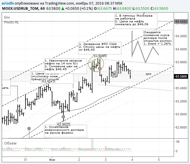 Если в Европе нефтетрейдеры смогут вернуть цены к уровню $46,43, то тогда после двенадцатидневного падения восходящая коррекция продолжится до появления результатов выборов президента в США. На фоне роста нефтяных котировок доллар/рубль останется торговаться ниже 64 рублей.