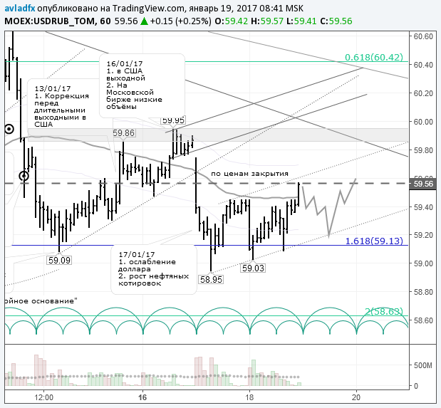 Продавцы доллара уже несколько раз проверили на прочность уровень 59,00 руб. Неспособность цен на нефть вернуться к максимуму 58,35 руб. откладывает их масштабное наступление. После вчерашнего отскока цены от 59,03 руб. хочется рассматривать дальнейший рост курса доллара, но как бы цена ни закрылась высоко, в четверг возможен новый тест уровня 59 руб. Не забываем про налоговый период и коррекцию по доллару. На четверг рассмотрю V-модель.