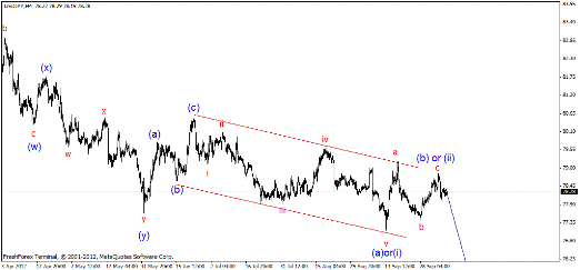 В связи со значительным снижением пары, раметка немного подкорректирована. В данный момент предполагается, что идет развитие волны (v), которая возможно примет вид конечного диагонального треугольника. В данный момент, предположительно завершается развитие волны ii, указанной модели. Если предположение верно, то в ближайшее время нас ожидает рост пары. Разметка отменится в случае пробития ценой критической отметки указанно на графике красной горизонтальной линией.