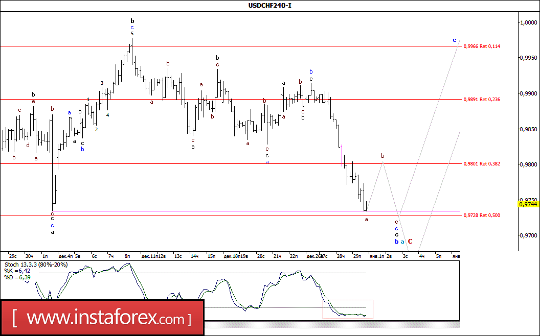 Торги последнего дня минувшей недели пара USD/CHF начала с продолжения развития нисходящего движения и, потеряв еще более 60 п.п., в конце дня нарушила минимум от 1 декабря (0,9735). Сложившаяся при этом волновая ситуация позволяет предполагать, что после 8 декабря валютная пара находилась в стадии формирования волны с, в составе значительно усложнившей свою волновую структуру, волны b, в а, в С. Если это так, несмотря на существенную перепроданность индикаторов, прежде чем выполнить разворот и обозначить начало будущей волны с, в а, в С, валютная пара может как минимум протестировать уровень 97-й фигуры.