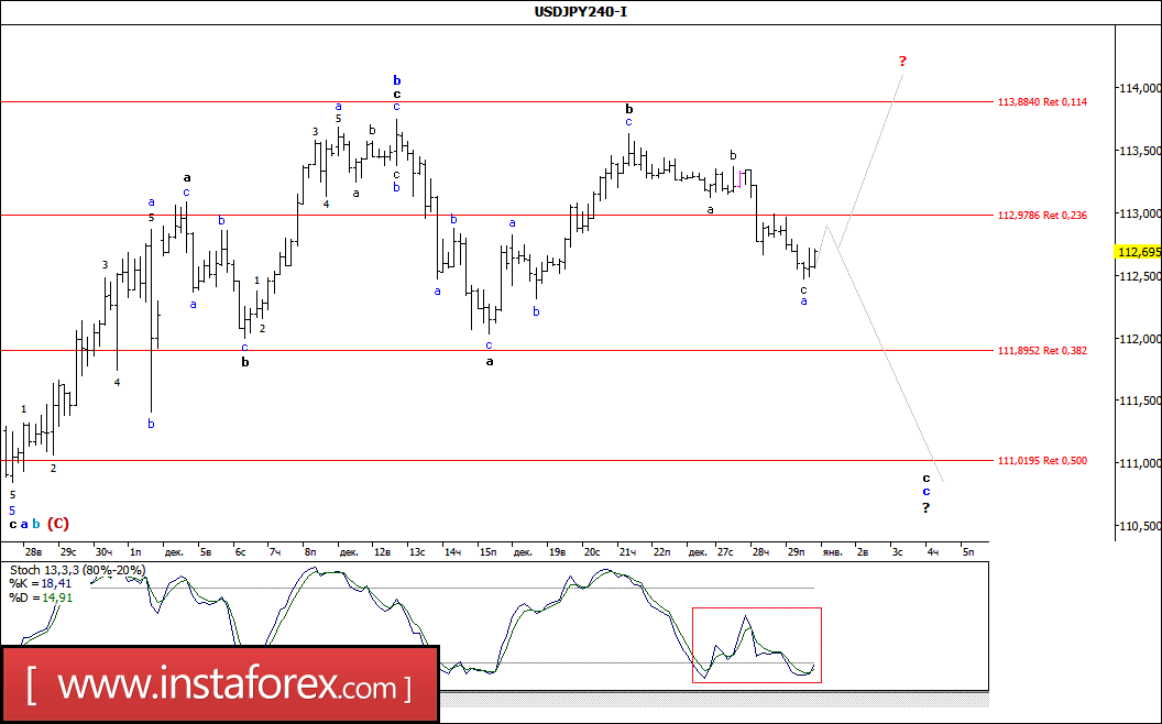 На волне общего ослабления доллара, торги последней сессии минувшего года пара USD/JPY начала с нисходящего движения и, потеряв в цене более 40 б.п., во второй половине дня пробила отметку 112,50. При этом можно предположить, что, несмотря на такое снижение, валютная пара оставалась в стадии формирования первых образующих волн в составе будущей волны с, в с, в b, в (С), расчетные цели которой простираются вплоть до уровня 111,00. В то же время, как уже отмечалось ранее, вероятность возобновления роста котировок и еще большего усложнения внутренней волновой структуры всей волны b, в b, в (С) по-прежнему не утратила своей актуальности.
