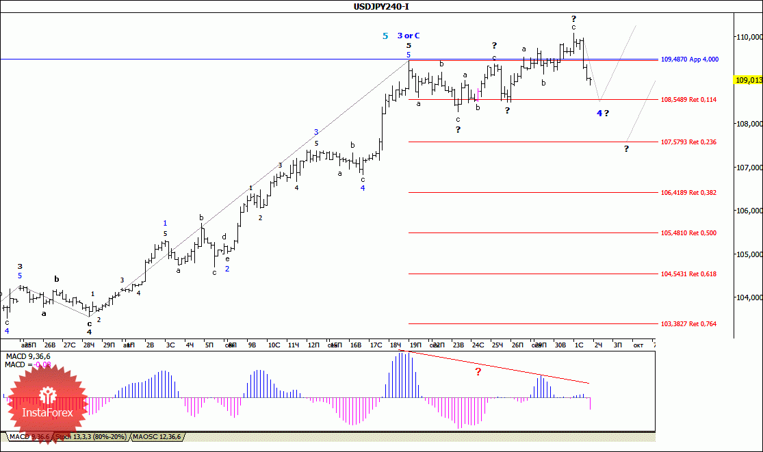 Вчерашняя отработка уровня 110-й фигуры, привела к обвальному падению цены по паре USD/JPY, более чем на 120 б.п., к отметке 108,86. При этом, не смотря на такую динамику развития текущей волновой ситуации, похоже на то, что валютная пара по-прежнему, остается в стадии формирования 4-й волны, в 5-й, которая приобрела признаки незавершенного диагонального треугольника. Если это так, то цена может продолжить падение не только к отметке 108.55, но возможно и к 107,55.