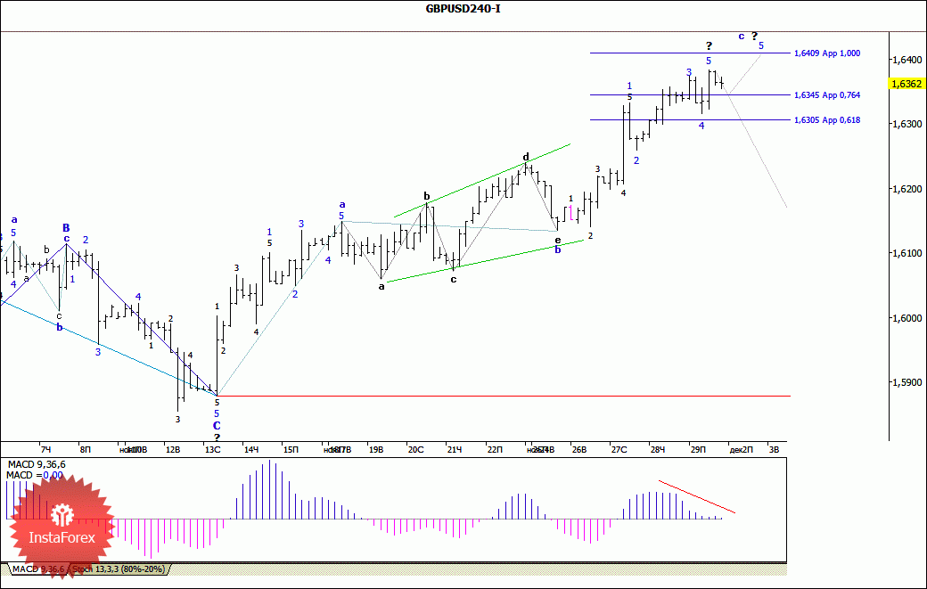Весь последний день минувшей недели пара EUR/USD пыталась завершить формирование внутренней волновой структуры 5-й волны, в с, во 2-й (или В) и только к концу торгов начала снижение, зафиксировавшись ниже уровня 36-й фигуры. При этом вся восходящая коррекция, получившая развитие от минимумов 7-8 ноября, приняла, в целом, завершенный вид. Если это так, то для валютной пары открываются перспективы нисходящего движения в направлении не только уровня 1.3300, но и к 1,3100. В то же время выглядящая не очень внятно вершина волны с может способствовать тому, что ее 5-я волна примет еще более сложную форму, а цена все же отработает расчетную цель, соответствующую отметке 1,3635.