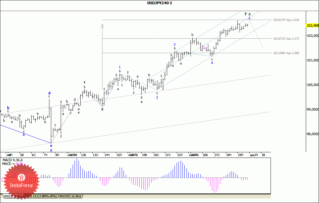 Инструмент продолжает построение повышательного участка тренда, который сильно усложняет свою внутреннюю волновую структуру. Повышение котировок продолжается с целями, расположенными около отметки 102,62, что соответствует 161,8% по Фибоначчи, и выше к 103 фигуре. В рамках нисходящей волны или набора волн может начаться понижение с целями, находящимися около отметок 101,87 и 101,28, что приравнивается к 127,2% и 100,0% по Фибоначчи. Повышательный коридор сохраняет перспективы построения восходящего участка тренда.