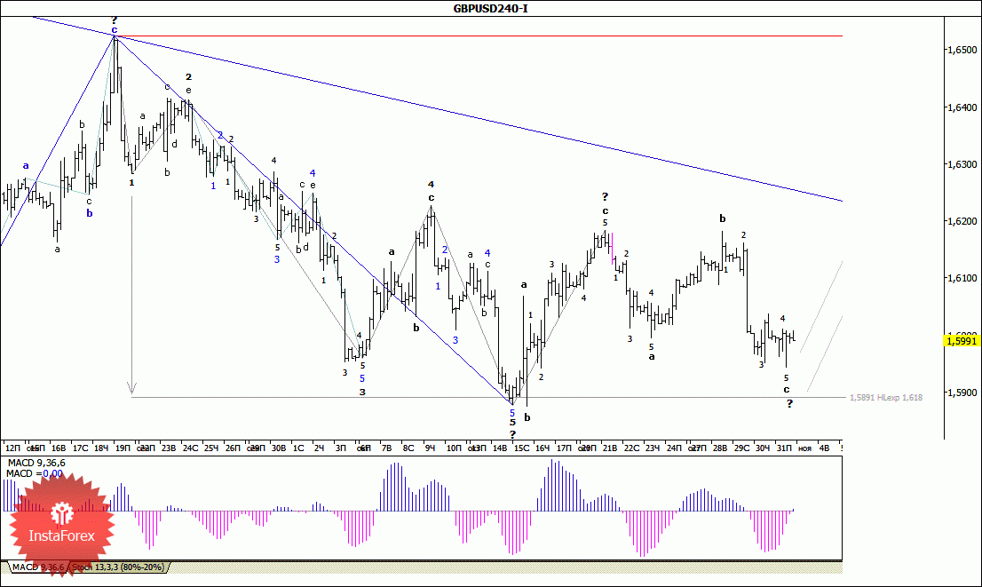 Попытка пары GBP/USD в ходе пятничных торгов возобновить нисходящее движение не увенчалась успехом, вследствие чего цена так и осталась вблизи уровня 60-й фигуры. При этом можно предположить, что волна с, в составе понижающего участка сложной коррекционной структуры, формирующейся от минимума 15 октября, приняла практически завершенный вид. Если это так, то валютная пара должна возобновить рост котировок или от минимума последнего дня прошедшей недели, или от уровня 1,5900.