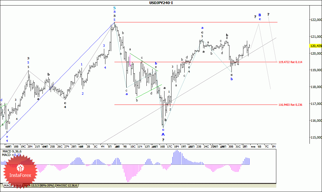Пятничным возвратом к предпраздничным максимумам пара USD/JPY значительно усложнила всю восходящую волновую структуру, формирующуюся от минимума 16-го декабря. При этом нельзя исключать того, что валютная пара, по-прежнему остается в стадии формирования волны В, которая приняла более протяженный вид. Если это так, то в процессе развития волны С, в этой В, существует вероятность роста котировок к максимуму 7-го декабря или даже пробоя ценой уровня 122-й фигуры.