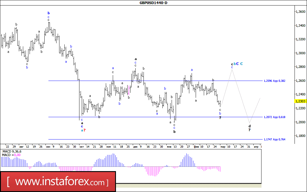Только после падения цены к минимумам 22 февраля в последний день минувшей недели пара EUR/USD смогла возобновить восходящее движение и завершить пятничную сессию над уровнем 06-й фигуры. Таким образом, можно предположить, что, несмотря на значительную волатильность торгов, валютная пара все же осталась в стадии формирования первых образующих волн в составе будущей волны с, в а, в е, в В. Если это так, то валютная пара может продолжить рост котировок в направлении первой расчетной цели для этой волны с, в а, в е, в В, расположенной в районе отметки 1,0850.
