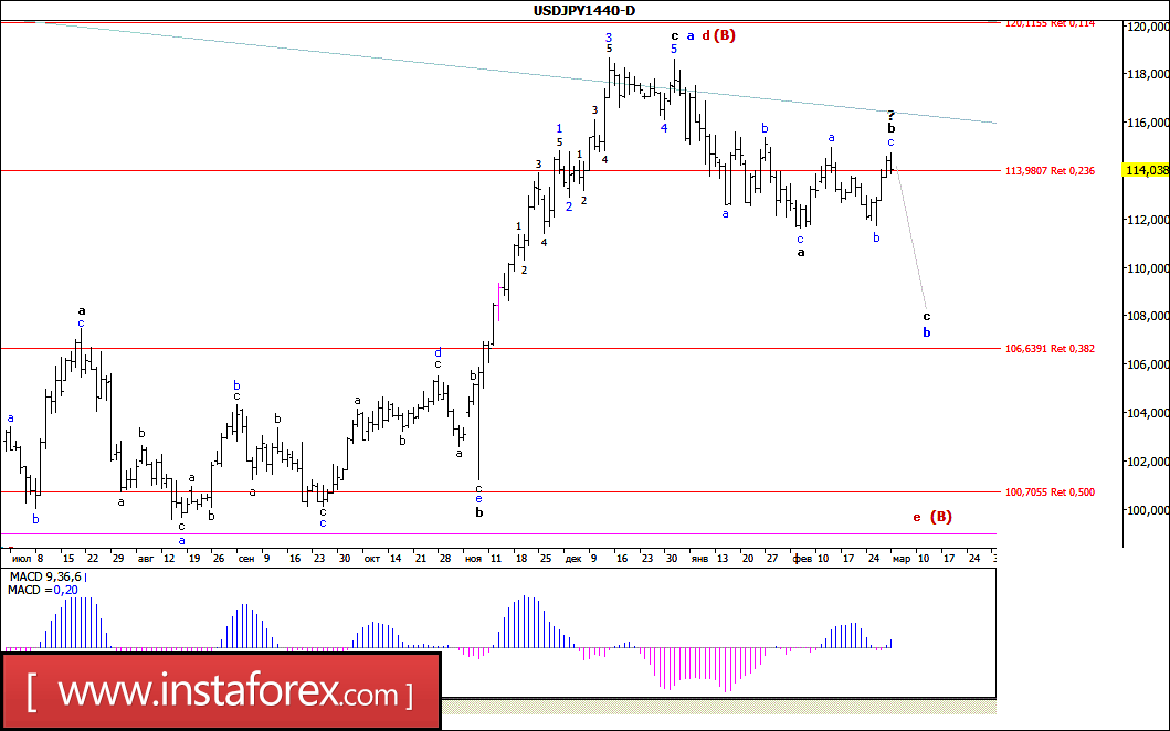 В начале минувшей недели пара USD/JPY возобновила восходящее движение и уже в четверг остановилась в районе отметки 114,75. При этом можно предположить, что валютная пара оставалась в стадии формирования волны b, в b, в d, в (В) (или b, в е, в (В)), в которой ее внутренняя волна с, вероятно, примет несколько укороченный вид. Если это так, то начавшееся в пятницу снижение котировок может получить дальнейшее развитие в направлении уровней 109-й, или даже 108-й фигуры.