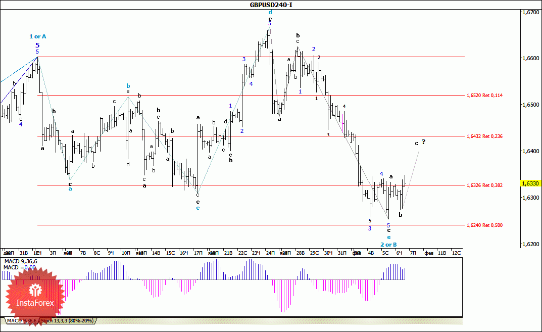 Британский фунт усложняет участок тренда, с идентификацией которого сейчас есть определенные проблемы. В рамках нисходящей волны инструмент может продолжить понижение котировок с целями, находящимися около отметки 1,6240, что соответствует 50,0% по Фибоначчи, и ниже. В рамках построения восходящей волны (возможно, в составе коррекционного набора волн) может начаться повышение с целями, расположенными около расчетных отметок 1,6432 и 1,6520, что соответствует 23,6% и 11,4% по Фибоначчи. Если предполагаемая волна 2 или B завершена, то ожидается построение сложной и протяженной повышательной волны 3 или С.