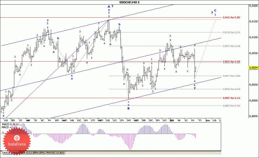 На вчерашних новостях от ЕЦБ, пара USD/CHF не смогла развить обозначившееся восходящее движение и от максимума дня, упав почти на 100 п.п., достигла отметки 0,8965. При этом, несмотря на такое значительное падение, можно предположить, что валютная пара по-прежнему находилась в стадии формирования 4-й волны, в С, которая приняла еще более сложную форму. Если это так, то от минимума минувшего дня цена должна бы возобновить рост в направлении январских максимумов или уровня 92-й фигуры