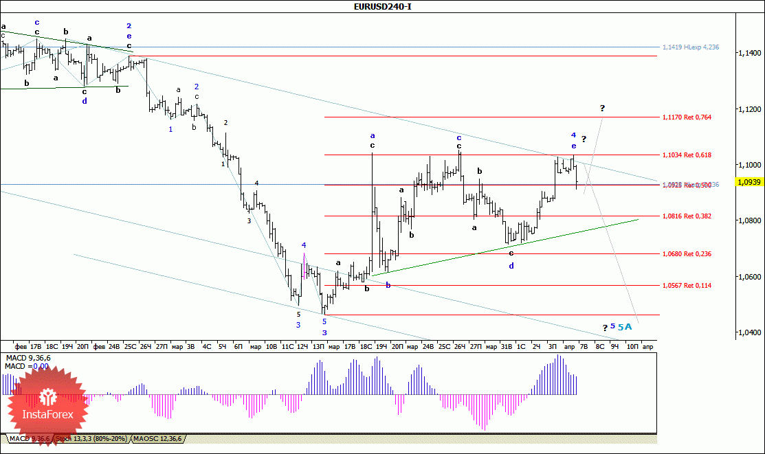 После пятничного масштабного роста, большую часть минувшего дня пара EUR/USD провела в узком ценовом диапазоне и только с открытием заокеанской сессии начала интенсивное снижение, остановившись в конце дня перед уровнем 9-й фигуры. При этом отход цены от отметки 1.1035 можно рассматривать как сигнал о завершении формирования 4-й волны, в 5-й, в А и попытку перехода валютной пары в стадию формирования будущей 5-й волны, в 5-й. Если это так и волна е, в 4-й, не примет еще более сложную форму, то обозначившееся нисходящее движение должно получить дальнейшее развитие в направлении целей, расположенных, как минимум, под отметкой 1,0460.