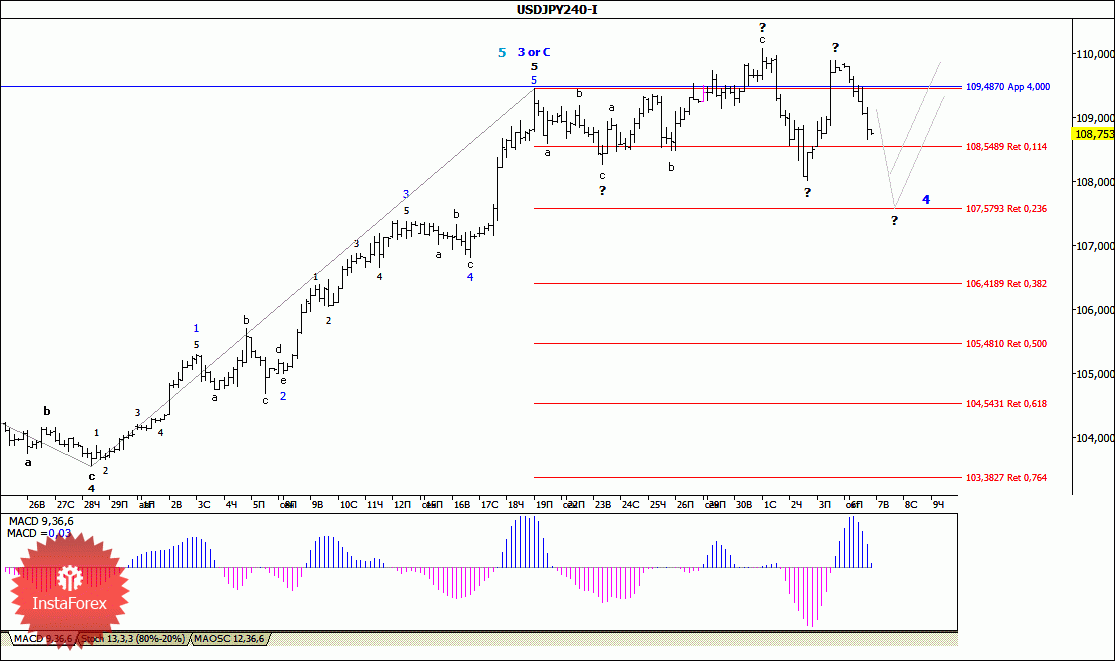 Как и ожидалось, вчерашние торги пара USD/JPY начала с нисходящего движения и, потеряв около 115 б.п., достигла отметки 108,65. Таким образом, в рамках сценария, предусматривающего формирование коррекционной 4-й волны, в 5-й, в виде расширяющегося треугольника, можно предположить, что валютная пара находится в завершающей стадии развития такой коррекционной структуры. Если это так, то цена должна продолжить снижение к уровню 108-й фигуры, или к отметке 107,55.