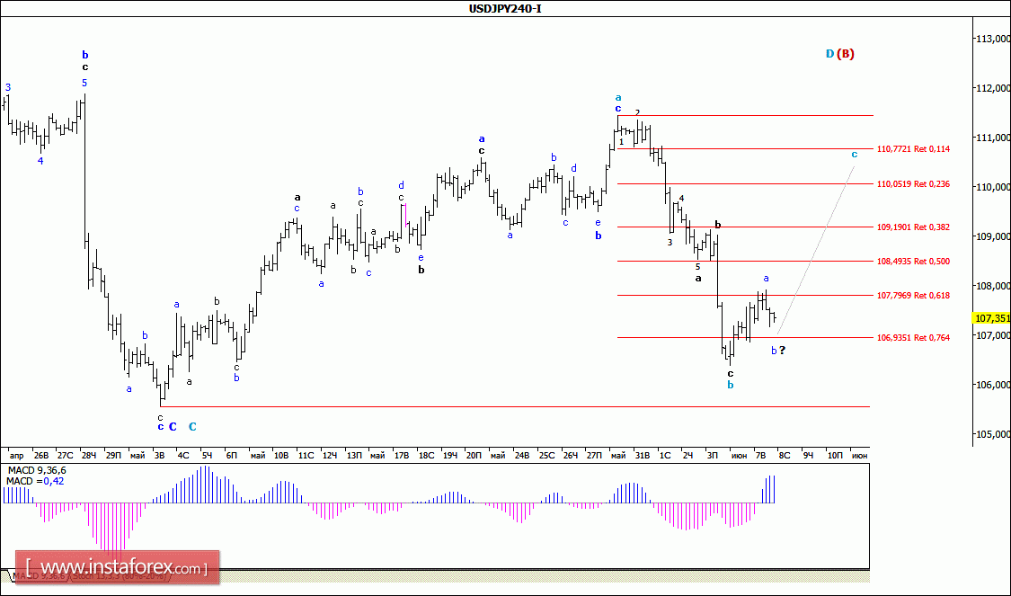 Несмотря на достаточно низкую активность вчерашних торгов, пара USD/JPY все же смогла достичь отметки 107.90, прежде чем возвратилась к уровням открытия дня. При этом можно предположить, что валютная пара оставалась в стадии формирования первых образующих волн в волновой структуре будущей волны с, в D, в (В). Если это так, то валютная пара продолжит рост котировок в направлении достигнутого в конце мая максимума, или к уровню 112-й фигуры.