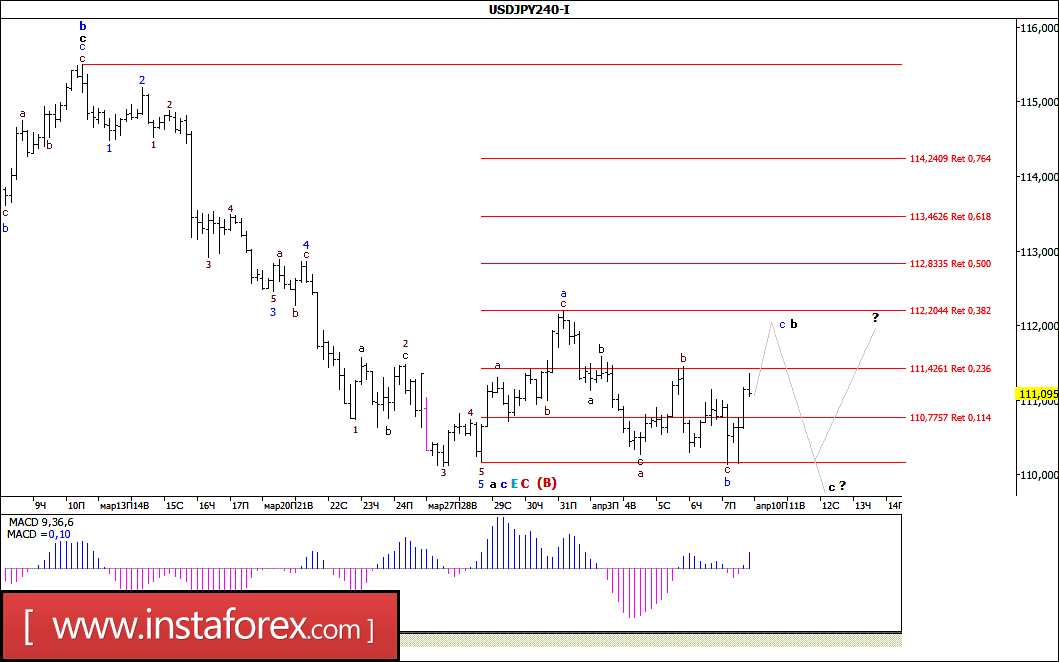 Предпринятая в начале пятничных торгов попытка пары USD/JPY продолжить начавшееся еще 31 марта снижение завершилась неудачей и до конца дня цена отскочила более чем на 120 б.п., зафиксировавшись над уровнем 111,00. Таким образом, можно предположить, что валютная пара находилась в стадии формирования волны b, в с, в Е, в С, в (В), которая начала приобретать признаки протяженной горизонтальной коррекции. Если это так, то еще некоторое время валютная пара будет оставаться в пределах коридора, ограниченного уровнями 110-й и 112-й фигур.
