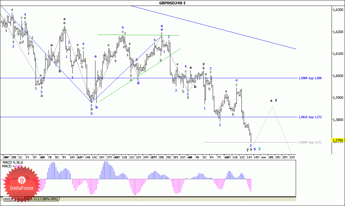 Набранная накануне динамика в развитии нисходящего движения позволила паре GBP/USD в ходе вчерашних торгов продолжить снижение и во второй половине дня пробить уровень 57-й фигуры. При этом внутренняя волновая структура всей 5-й волны, в 3-й, в очередной раз приняла еще более сложную форму, что в свою очередь позволяет квалифицировать минимумы минувшего дня в качестве завершения 3-й волны, в 5-й, в 3-й. Если это так, то сохраняя общую направленность на достижение отметки 1.5585 валютная пара может перейти в стадию формирования 4-й волны, в 5-й, в 3-й.