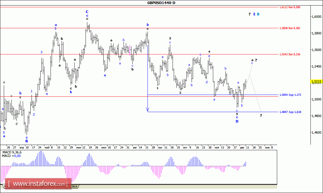 Фунт стерлингов находится в стадии построения понижательного участка тренда, который очень усложняет свою внутреннюю волновую структуру. Понижение котировок может возобновиться с целями, расположенными около отметок 1,5054 и 1,4847, что приравнивается к 127,2% и 161,8% по Фибоначчи, в рамках усложненной волны с в D в B. В рамках повышательной волны, предположительно E в B, повышение котировок началось с целями, расположенными вблизи отметок 1,5543 и 1,5858, что соответствует 23,6% и 38,2% по Фибоначчи.