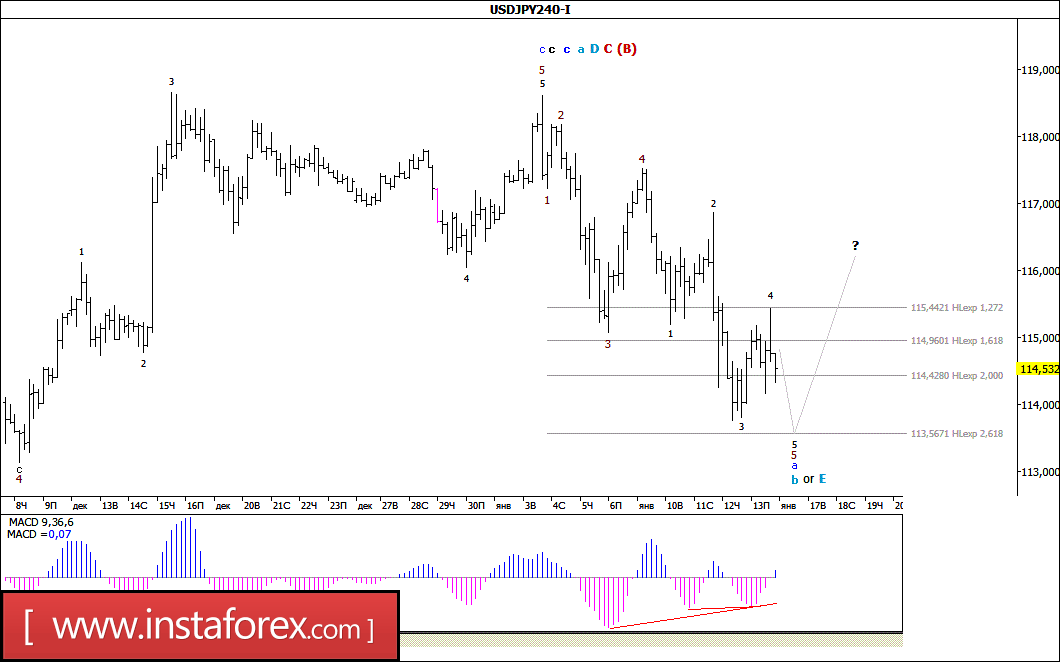 Инструмент предположительно завершил построение волны D в С в (B). Если это предположение верно, то понижение котировок продолжиться в рамках волны E в С в (B) (или все-таки b, в D, в С, в (В)) с целями, расположенными около расчетной отметки 113,56, что приравнивается к 261,8% по Фибоначчи, и ниже около 113 фигуры. В рамках построения восходящей волны, возможно с в D в С в (B), повышение котировок может начаться с целями, находящимися около отметки 118,46, что соответствует 200,0% по Фибоначчи, и выше. Конвергенции MACD_ака предупреждают о готовности инструмента к построению повышательной волны.
