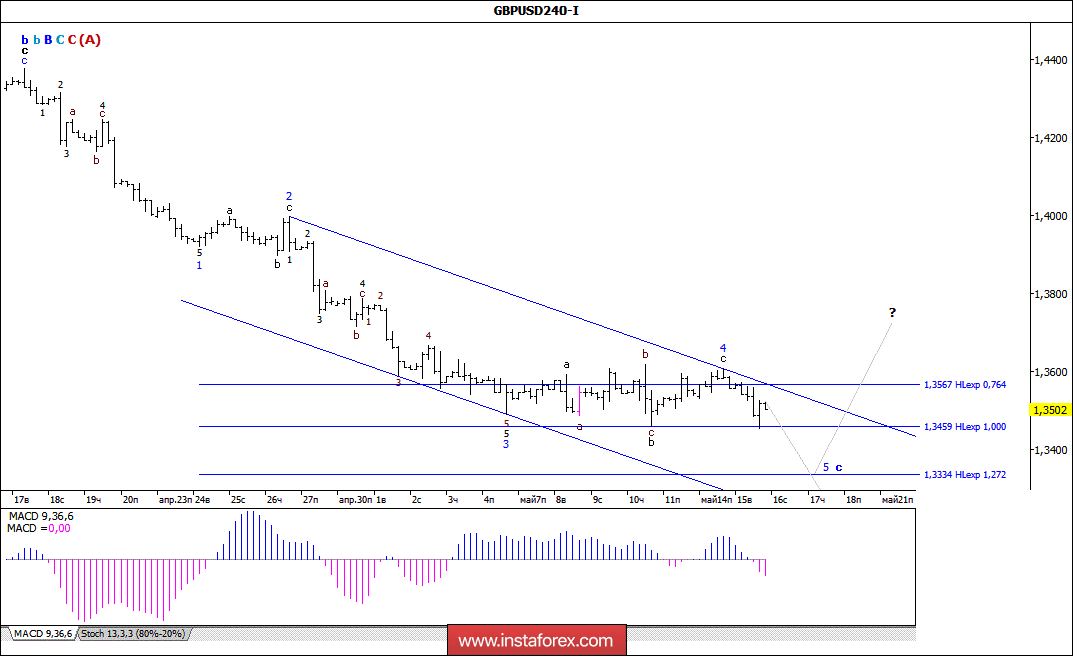 Так и не сумев выполнить разворот, в ходе вчерашних торгов пара GBP/USD возобновила нисходящее движение и, обновив достигнутый 10-го мая минимум (1,3460), во второй половине дня упала к отметке 1,3450. Таким образом, можно предположить, что валютная пара все же возвратилась к процессу формирования волны с, в b, в В, в С, в С, в (A), в виде полноценной пятиволновой структуры. Если это так, то у валютной пары могут появиться перспективы для снижения котировок вплоть до отметки 1,3175.