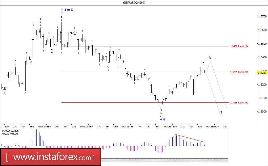 Несмотря на достаточно сильную дивергенцию MACD_ака, в ходе пятничных торгов пара GBP/USD смогла продолжить восходящее движение и во второй половине дня отработать отметку 1,3335. При этом можно предположить, что валютная пара оставалась в стадии формирования близящейся к своему завершению волны b, в 4-й. Если это так, то от максимума последнего дня минувшей недели, или даже после тестирования уровня 34-й фигуры, валютная пара может возобновить снижение котировок в направлении уже достигнутого 6 октября минимума (1,3025).