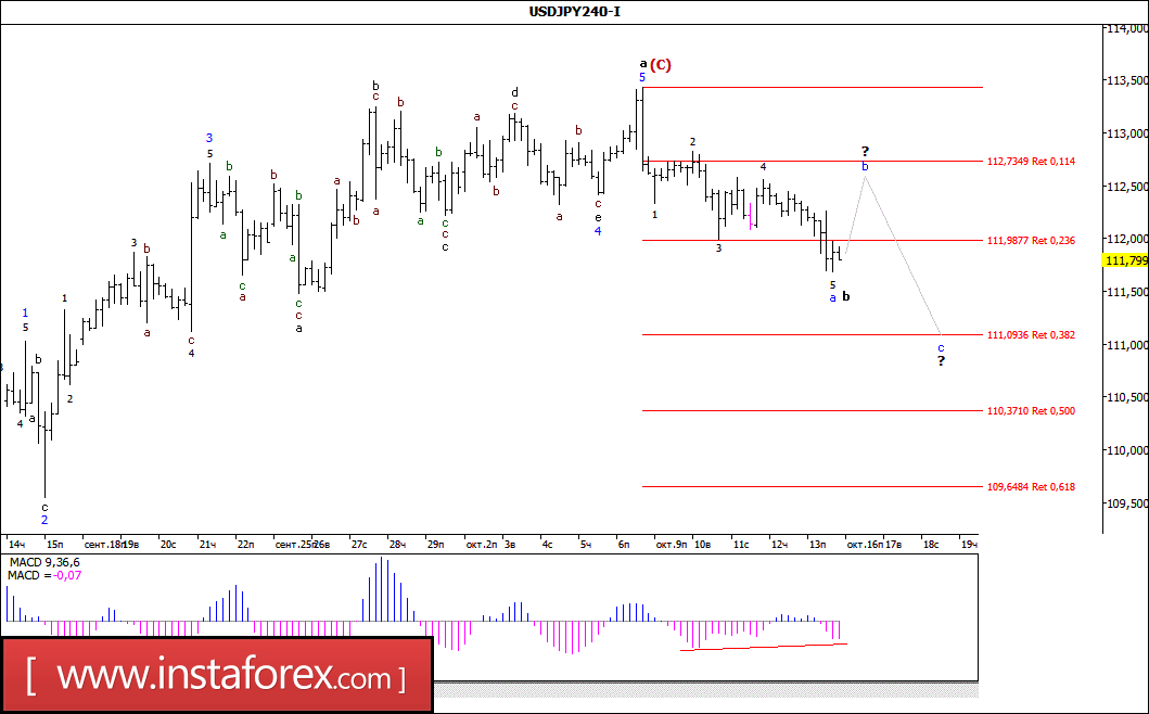 Так и не сумев выполнить разворот, в ходе пятничных торгов пара USD/JPY продолжила снижение и, потеряв около 60 б.п., во второй половине дня достигла отметки 111,70. Таким образом, в связи с тем что цене удалось закрепиться под уровнем 112-й фигуры, складывающаяся волновая ситуация позволяет рассматривать максимум от 6 октября (113,43) в качестве вершины принявшей вид пятиволновой структуры волны а, в будущей (С). Если это так, то в процессе развития волны b, в (С) валютная пара может продолжить нисходящее движение в направлении уровня 111,00.