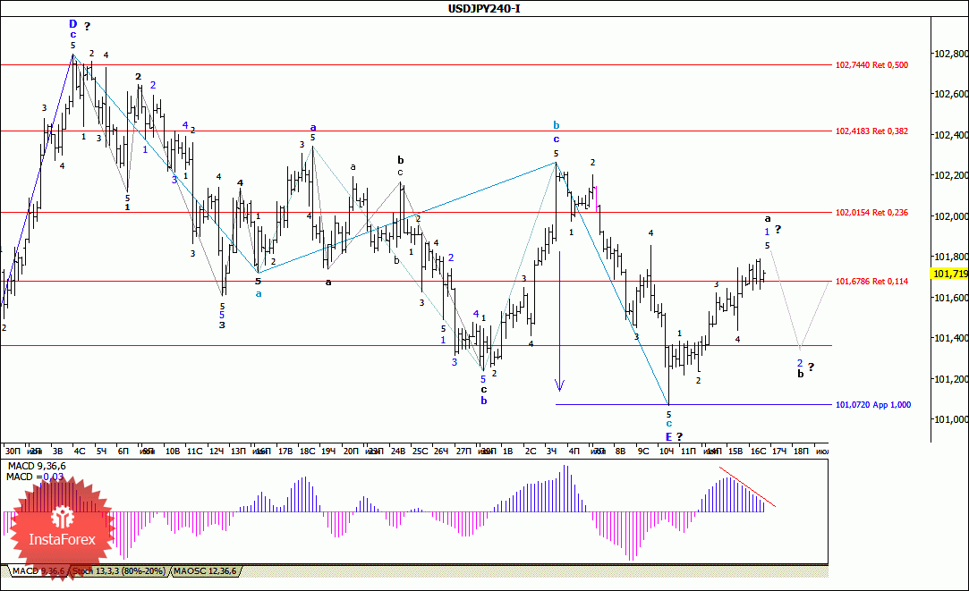 Инструмент преобразовал всю волновую разметку, которая выглядит очень сложно и нестандартно. Повышение котировок может продолжиться в рамках первых волн нового повышательного участка тренда с целями, расположенными около отметок 102,01 и 102,41, что соответствует 23,6% и 38,2% по Фибоначчи, и выше. В рамках понижательной коррекционной волны может начаться понижение с целями, находящимися около отметки 101,07, что соответствует 100,0% по Фибоначчи. Если текущая волновая разметка верна, то понижательный участок тренда завершил свое построение. Дивергенция MACD_ака предупреждает о готовности инструмента к построению коррекционной волны.