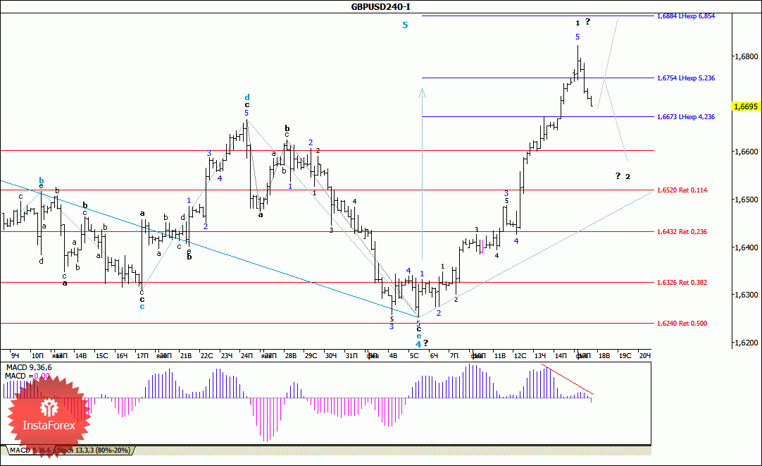 В целом ожидаемо, пробой уровня 68 фигуры привел в начале вчерашних торгов к динамичному отскоку цены по паре GBP/USD почти на 130 п.п. от достигнутого максимума. Таким образом можно предположить, что 5-я волна, в предполагаемой 1-й (в 5-й), завершила процесс своего формирования, а обозначившаяся нисходящая коррекция будет развиваться в направлении отметок 1,6550-1,6530. В то же время внутренняя волновая размерность этой предполагаемой 1-й волны, в 5-й, позволяет валютной паре продолжить рост котировок вплоть до отметки 1.6885, что в свою очередь приведет к еще большему усложнению ее внутренней волновой структуры.