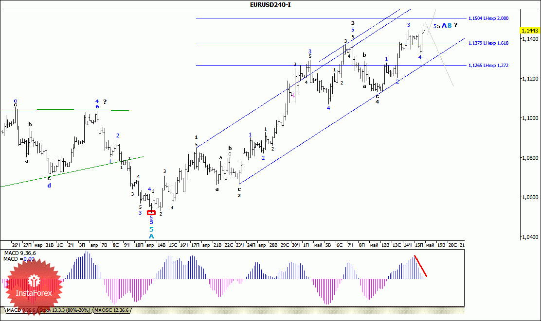 Как и ожидалось, слабые данные по промпроизводству в США за апрель, не позволили паре EUR/USD в ходе пятничных торгов развить обозначившееся ранее нисходящее движение, и, возобновив рост, цена закрепилась над максимумом минувшего четверга. Таким образом, валютная пара усложнила всю внутреннюю волновую структуру 5-й волны, в предполагаемой А, в В, придав ей форму полноценной пятиволновой структуры. При этом если цена не сможет выполнить разворот от уже достигнутого максимума, то можно ожидать дальнейшего роста котировок вплоть до уровня 17 фигуры.