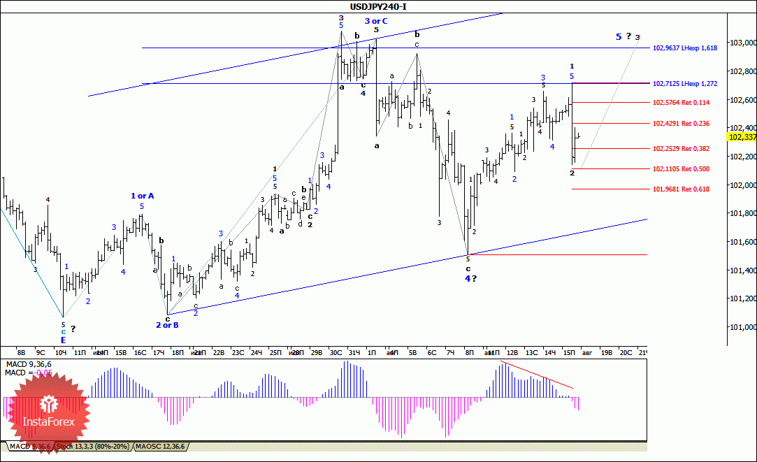 Инструмент продолжает построение повышательного участка тренда. Если текущая волновая разметка верна, то повышение котировок возобновится в рамках волны 3 в 5 повышательного участка тренда с целями, расположенными около отметок 102,71 и 102,96, что соответствует 127,2% и 161,8% по Фибоначчи, и выше. В рамках понижательной коррекционной волны (возможно в составе волны 5) продолжается понижение с целями, находящимися вблизи отметок 102,11 и 101,96, что приравнивается к 50,0% и 61,8% по Фибоначчи. Дивергенция MACD_ака предупреждала о готовности инструмента к построению коррекционной волны.